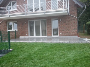 Terrassenbau Bild nachher![]() Ab. Bild - Terrasse mit Naturstein Palisaden und Betonstein |